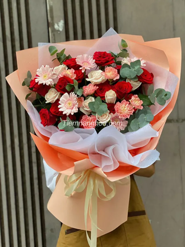 Lưu ý: Các sản phẩm hoa của Tiệm Nàng Hoa thường sử dụng các loại hoa theo mùa có sẵn tại cửa hàng để đảm bảo tính thẩm mỹ và độ bền. Sản phẩm thực tế sẽ tương tự khoảng 80-90% so với hình ảnh mẫu.