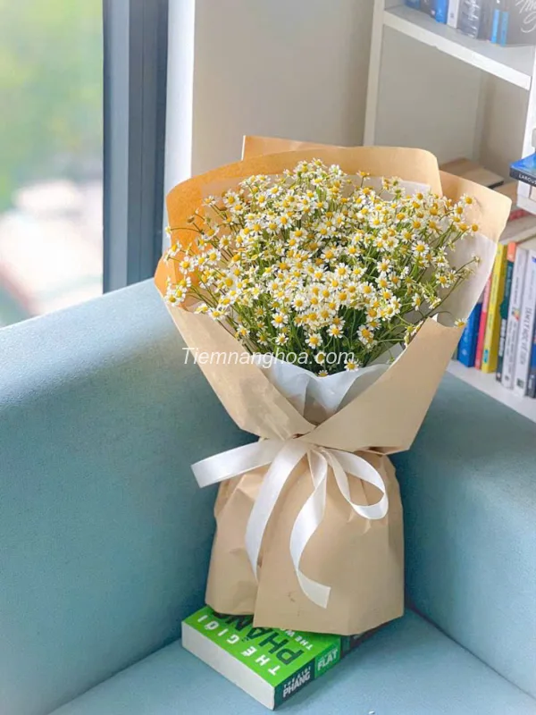 Bó hoa được kết từ những cành cúc tana nhỏ xinh, trắng muốt điểm nhụy vàng, mang vẻ đẹp dịu dàng và trong trẻo.