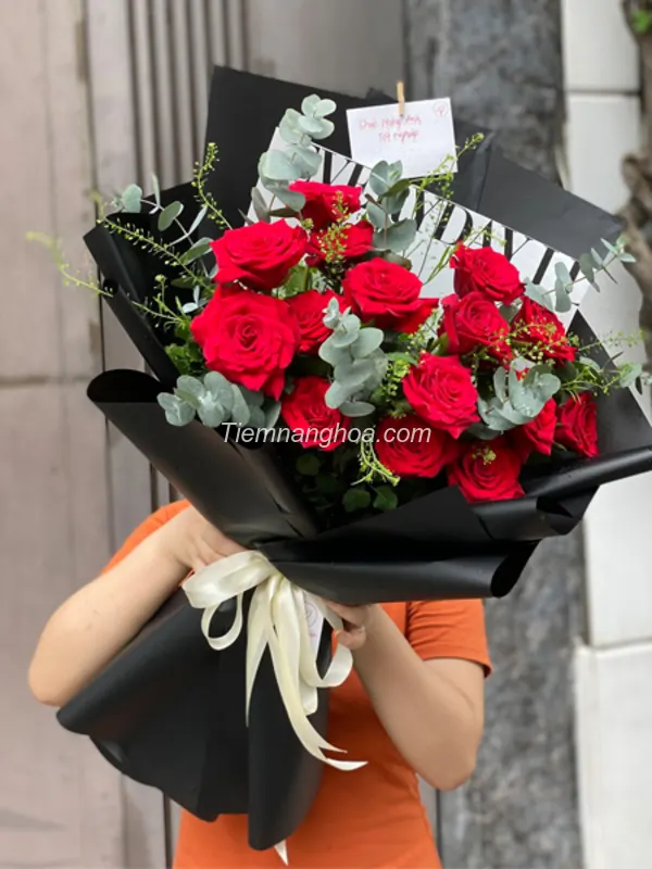 Bó hoa này có thiết kế tỉ mỉ, với những bông hoa hồng được sắp xếp hài hòa và cân đối. Với màu đỏ tươi sáng, những bông hoa này tạo ra một sự tương phản nổi bật, làm cho bó hoa trở nên đặc biệt và quyến rũ.