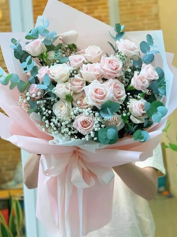Màu hồng nhạt của các bông hoa hồng mang trong nó vẻ đẹp dịu dàng và thanh khiết. Sự kết hợp của tone màu này tạo nên sự tương phản tinh tế và đẹp mắt. Những bông hoa hồng được sắp xếp một cách tỉ mỉ, tạo nên một cấu trúc thẩm mỹ với sự cân đối và hài hòa.
