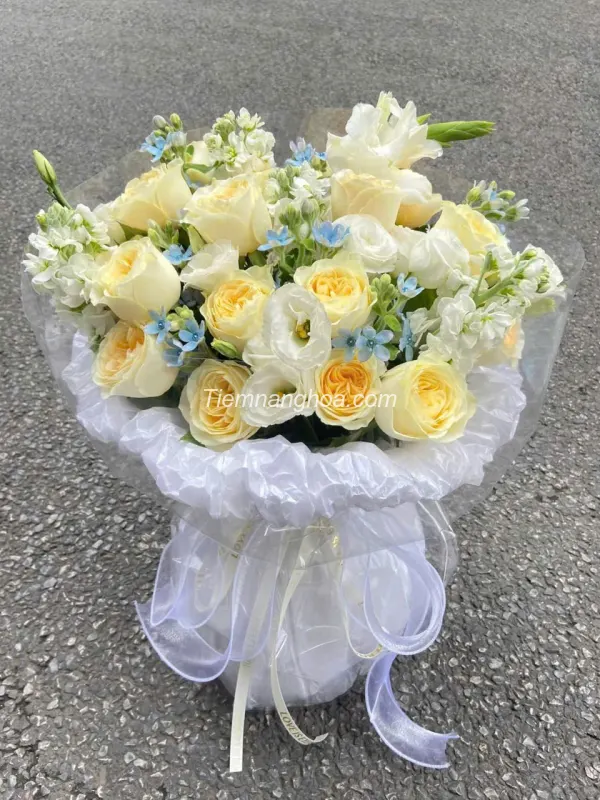 Khám phá vẻ đẹp thuần khiết và sự sang trọng trong từng cánh hoa với bó hoa được thiết kế tỉ mỉ, kết hợp hài hòa giữa các loài hoa quý phái.