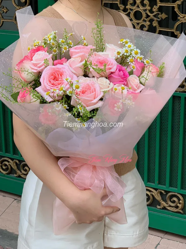 Bó hoa được gói bằng giấy gói hàn quốc mềm mại và tinh tế. Màu sắc của giấy gói hàn quốc thường là những tông màu pastel nhẹ nhàng, tương thích hoàn hảo với vẻ đẹp của các bông hoa hồng.