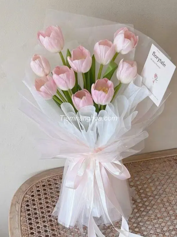 Bó hoa được kết từ 10 bông tulip hồng nhạt mềm mại, dịu dàng, tượng trưng cho tình yêu ngọt ngào, sự quan tâm và những cảm xúc chân thành.