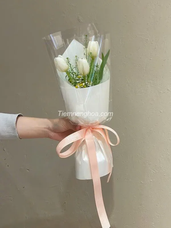 Bó hoa gồm 3 bông tulip trắng tinh khiết, được sắp xếp đơn giản nhưng đầy tinh tế.