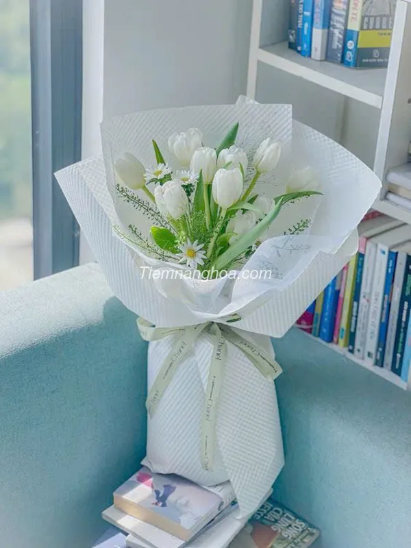 Bó hoa được kết từ 10 bông tulip trắng tinh khiết, cánh hoa mềm mại, thanh thoát, mang đến vẻ đẹp tối giản nhưng vô cùng cuốn hút.