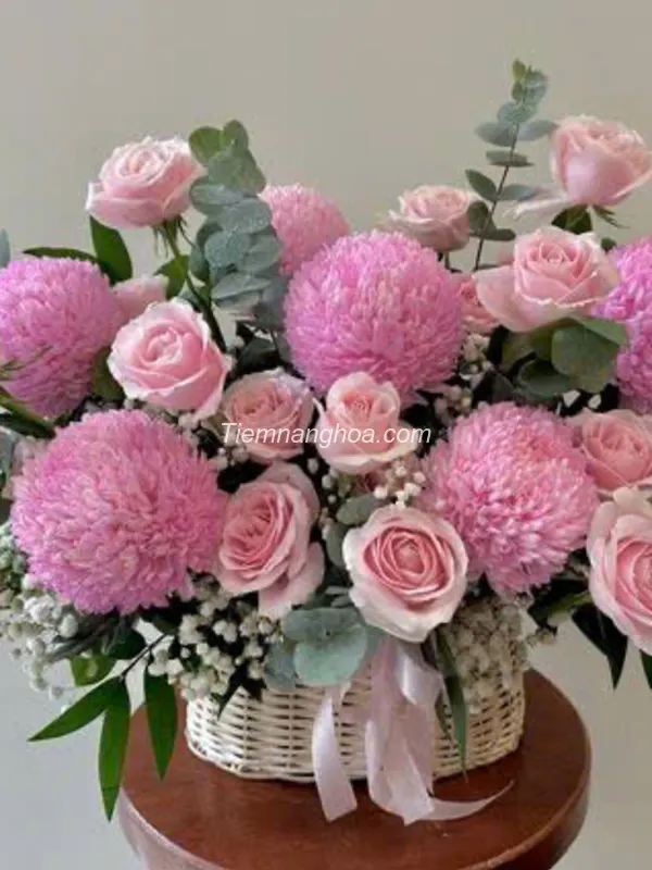Giỏ hoa được thiết kế tinh tế với những bông cúc mẫu đơn hồng pastel mềm mại, kết hợp cùng hoa hồng pastel lãng mạn, tạo nên một tổng thể hài hòa, sang trọng và đầy cuốn hút.