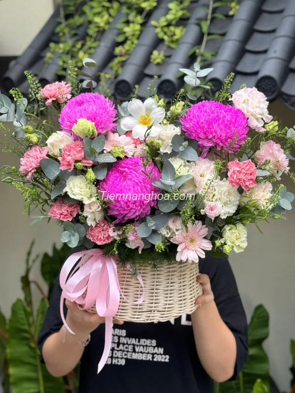 Giỏ hoa được thiết kế tinh tế với những bông cúc mẫu đơn hồng nổi bật, kết hợp cùng hoa cẩm chướng, cát tường, cúc họa mi và lá mang lại tổng thể mềm mại, tươi sáng và đầy sức sống.