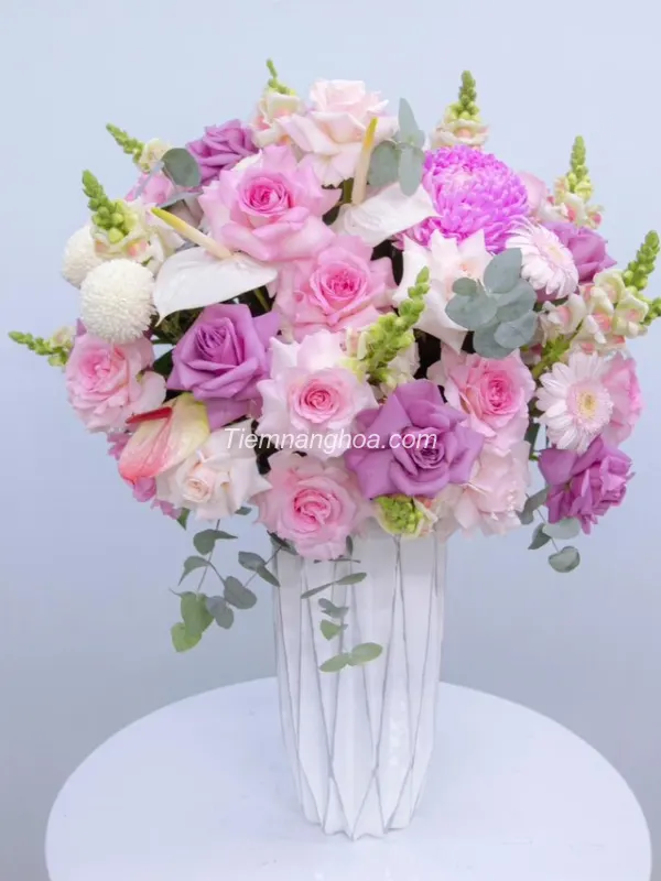 Lưu ý: Các sản phẩm hoa của Tiệm Nàng Hoa thường sử dụng các loại hoa theo mùa có sẵn tại cửa hàng để đảm bảo tính thẩm mỹ và độ bền. Sản phẩm thực tế sẽ tương tự khoảng 80-90% so với hình ảnh mẫu.