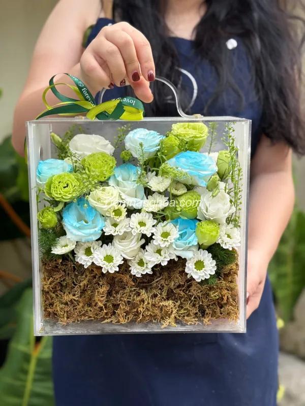 Sản phẩm là sự kết hợp hài hòa giữa vẻ đẹp thanh lịch của hoa cát tường, nét rực rỡ của hoa cúc Rosi và sự quyến rũ cổ điển của hoa hồng. Tất cả được điểm xuyết bởi lớp rêu khô tự nhiên, tạo nên một tổng thể độc đáo và ấn tượng.