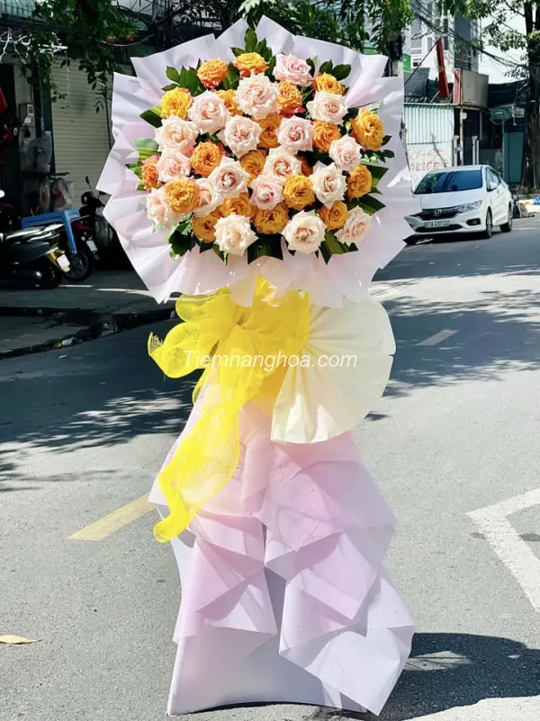 Kệ hoa khai trương KT-05 thường được chọn lựa với màu sắc tươi sáng và hài hòa, tượng trưng cho sự may mắn và thành công. Các loại hoa phổ biến được sử dụng trong hoa khai trương bao gồm hoa hồng vàng, hoa hồng cam và các hoa lá phụ khác. Hoa khai trương thường được sắp xếp trong các kệ hoa hoặc bó hoa lớn, tạo nên một tác phẩm nghệ thuật đầy màu sắc và độc đáo.